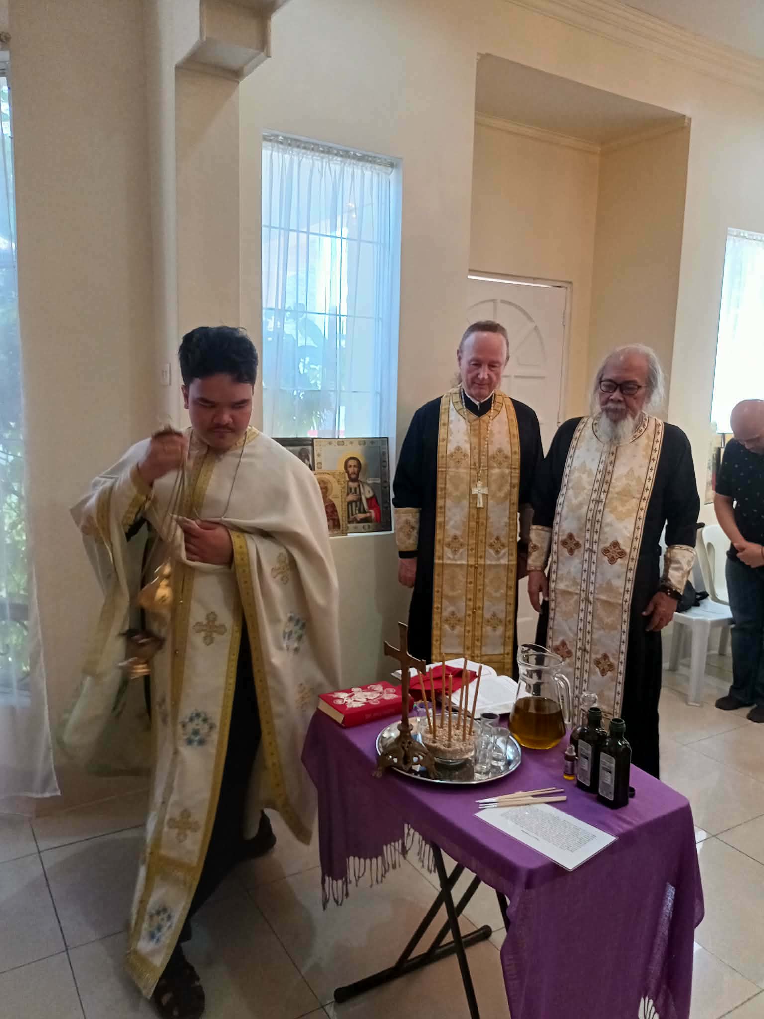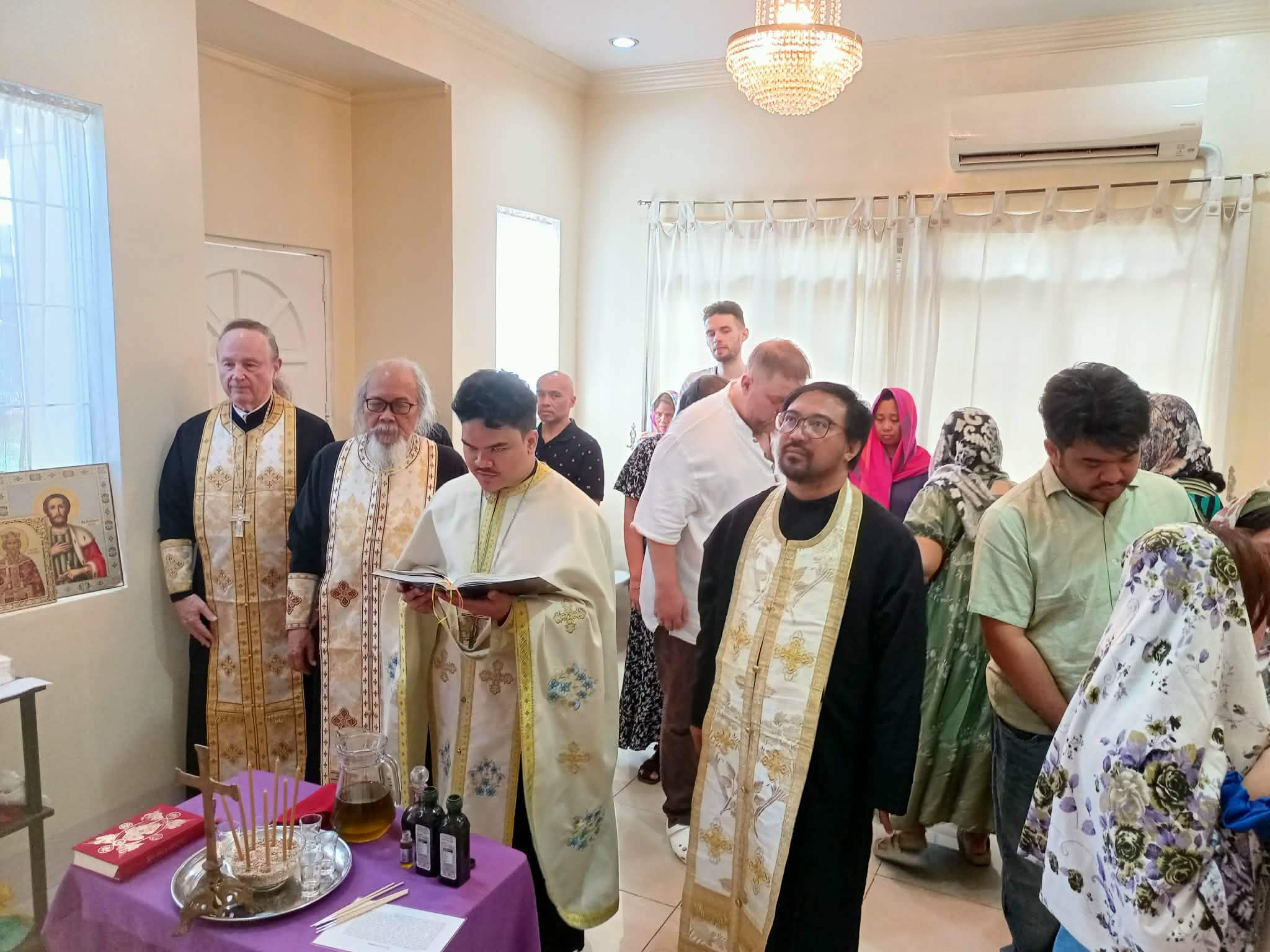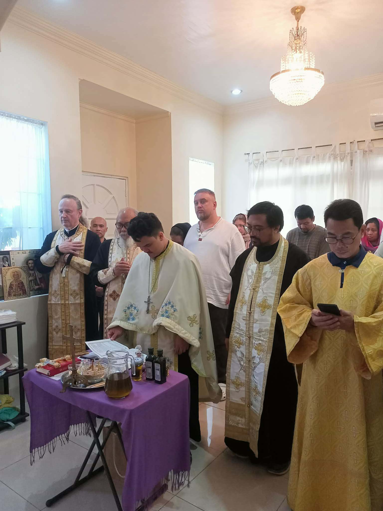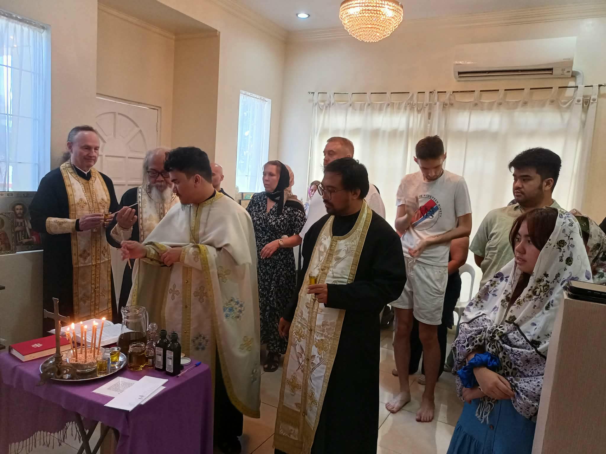 On Friday of the sixth week of Lent, the Sacrament of Unction took place at the Parish of the Iveron Icon of the Mother of God in Manila. Priests of the Manila Deanery participated: Archimandrite Philemon (Castro), Priest David Grubbs, Hieromonk John (Gondayao), and Priest Luke Abouna of the Antiochian Orthodox Church.