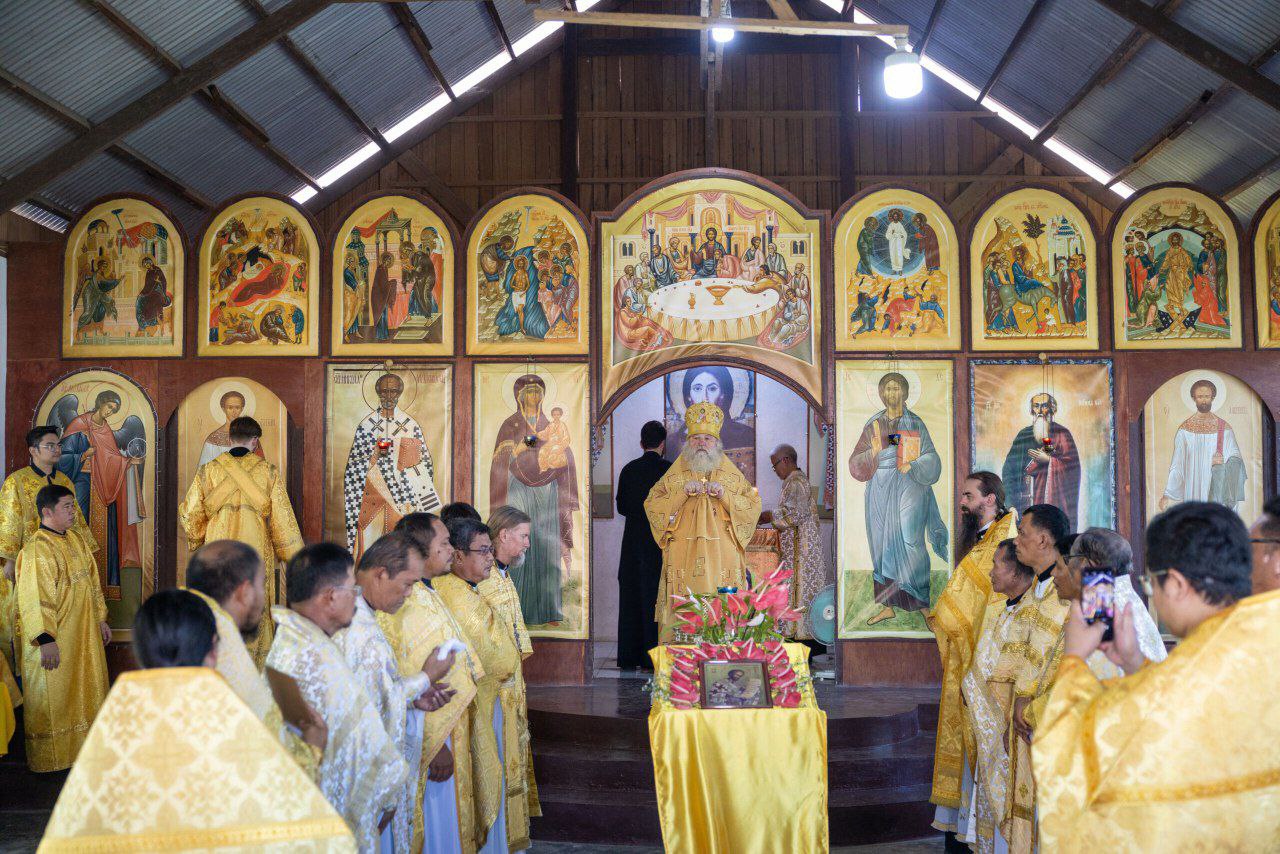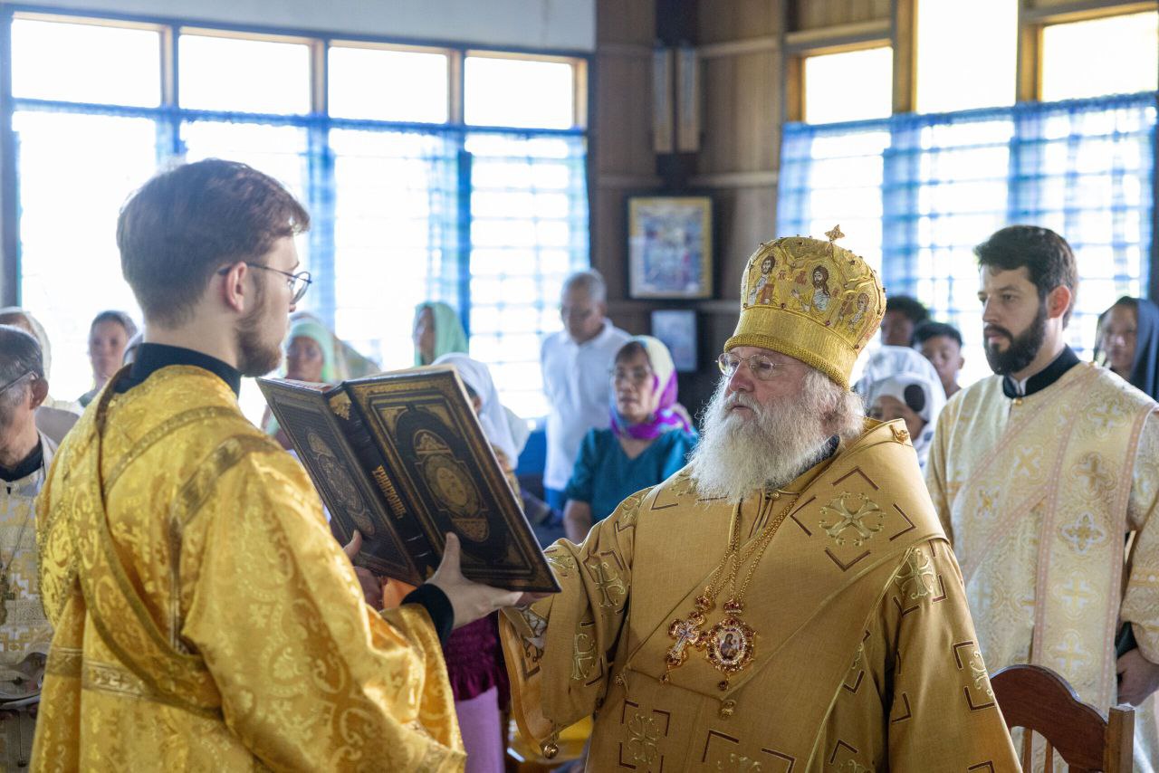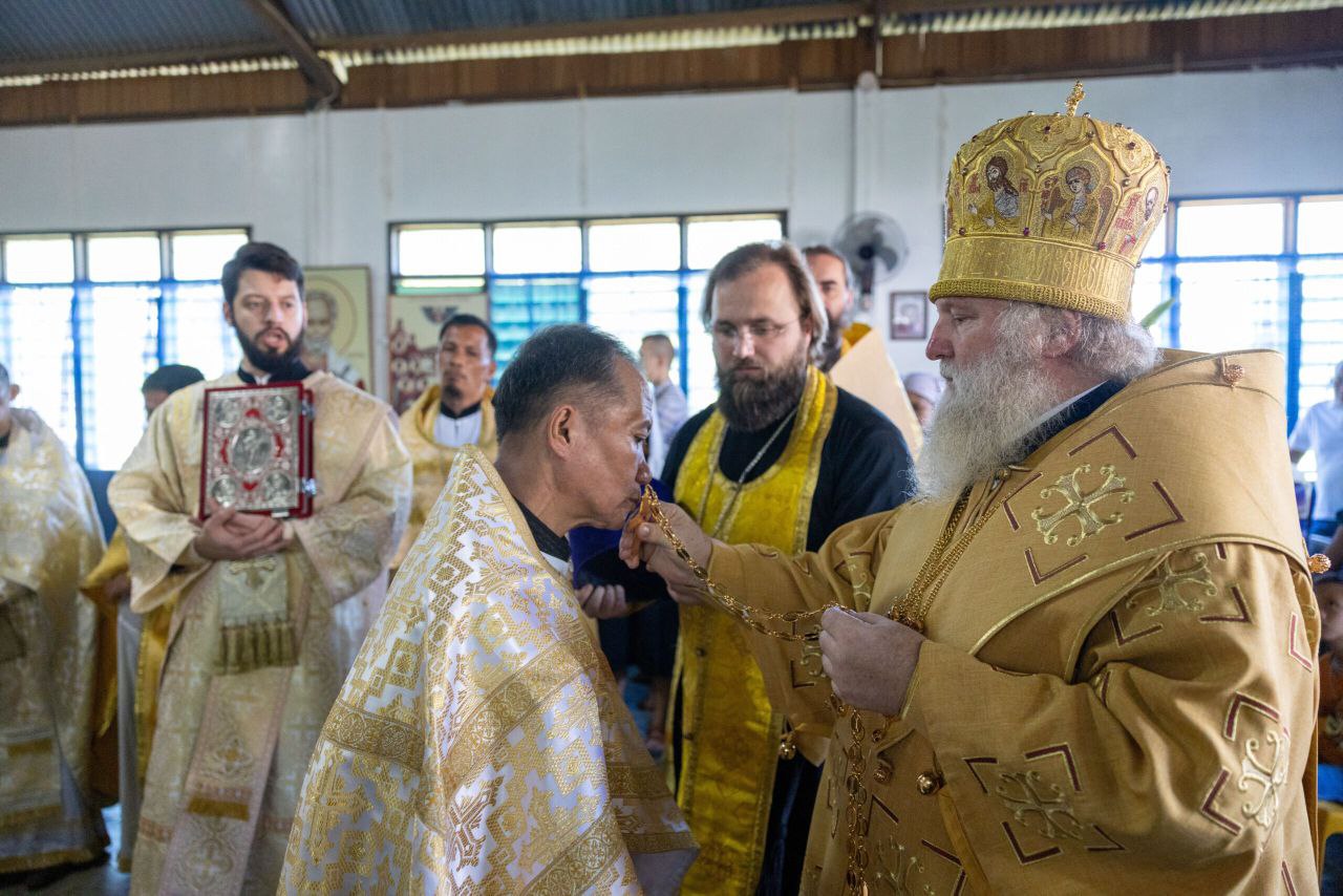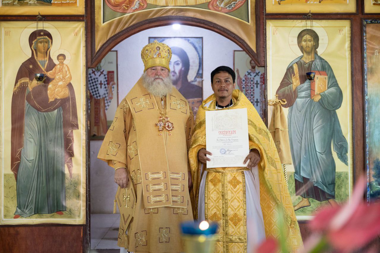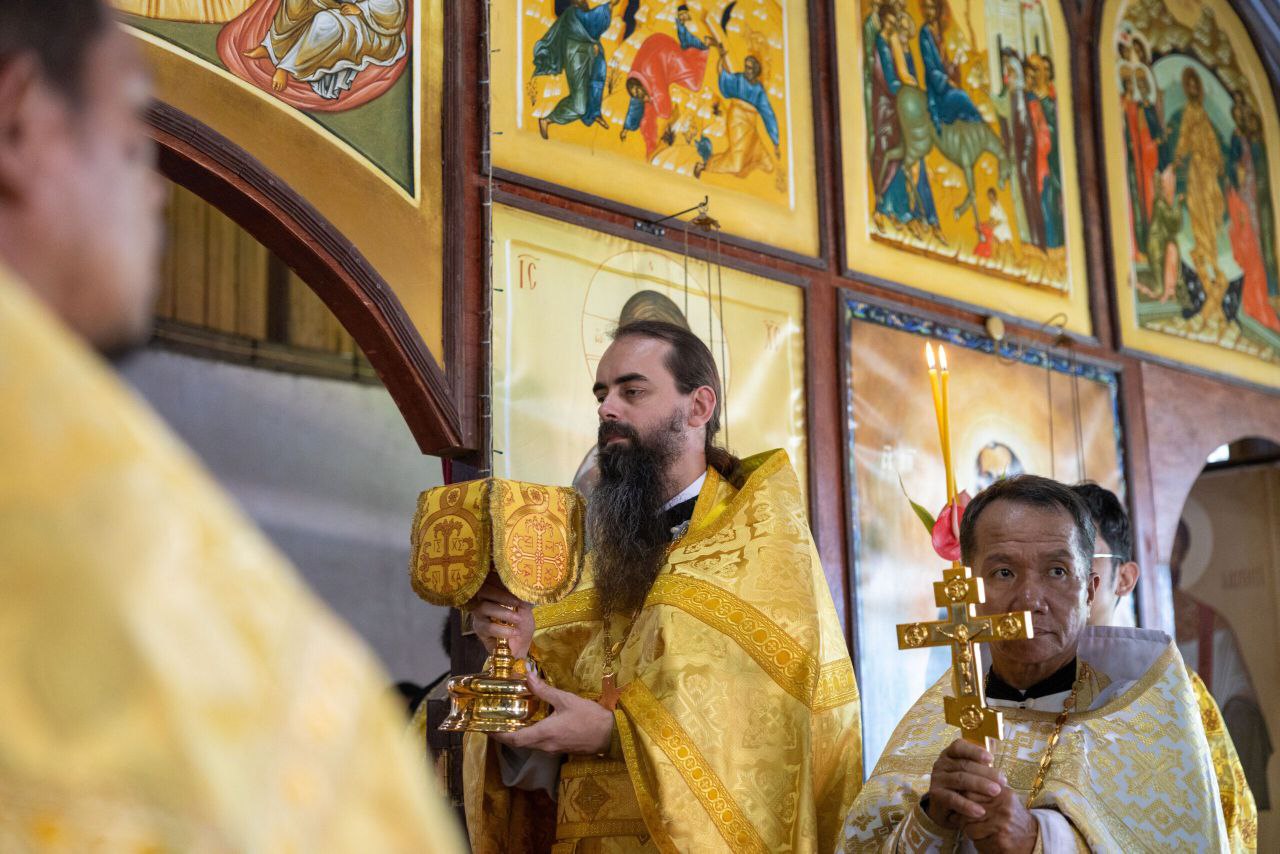 Его Высокопреосвященству сослужили секретарь Филиппинско-Вьетнамской епархии иеромонах Корнилий (Молев) и духовенство Филиппинско-Вьетнамской епархии. Диаконский чин возглавил диакон Даниил Матвеев.
