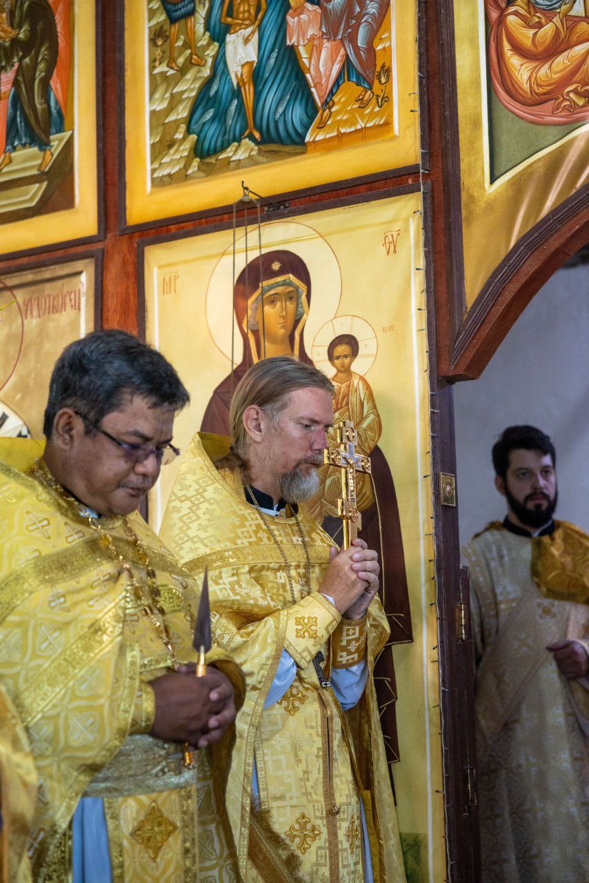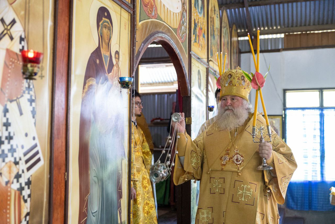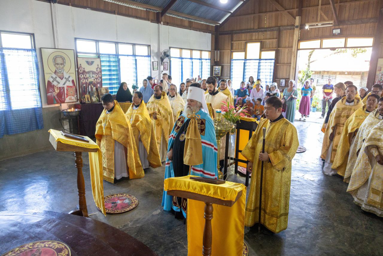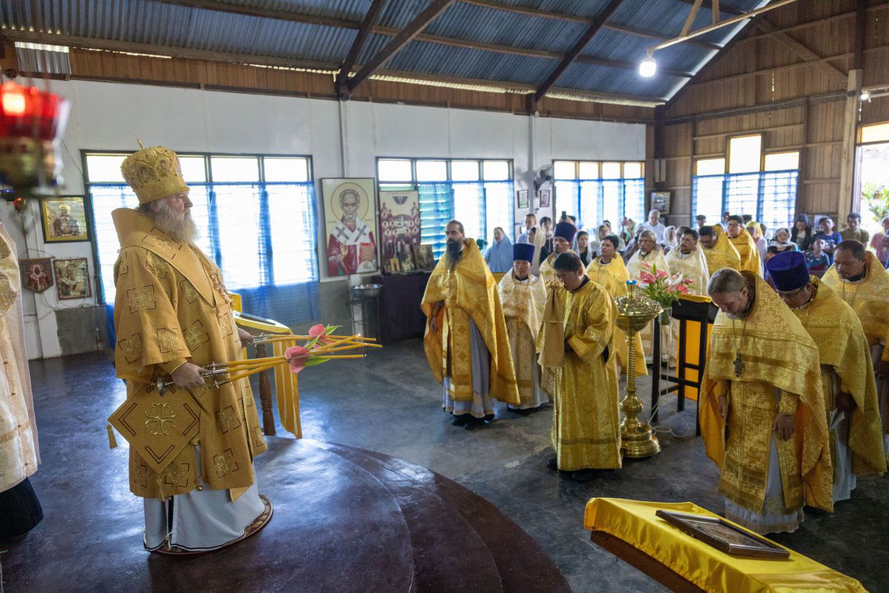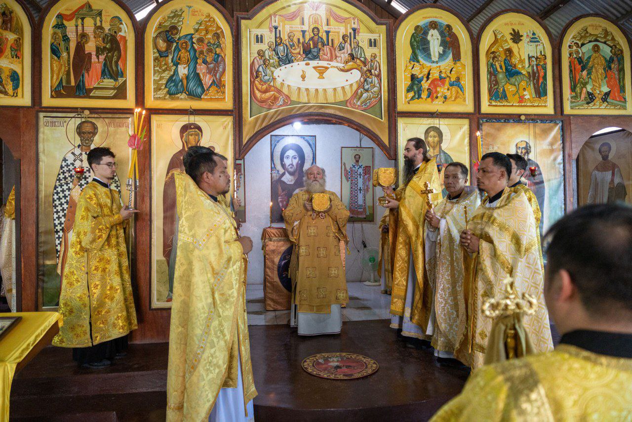 Его Высокопреосвященству сослужили секретарь Филиппинско-Вьетнамской епархии иеромонах Корнилий (Молев) и духовенство Филиппинско-Вьетнамской епархии. Диаконский чин возглавил диакон Даниил Матвеев.